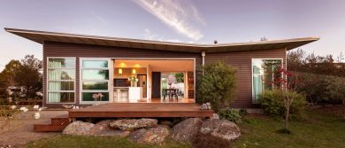 Started on a napkin in the owners’ restaurant, the concept for this house maximizes the site’s uninterrupted northern exposure over the Clutha River whilst taking into account the strict height covenants with recession planes. The house wraps itself around a West-facing walled courtyard which captures afternoon sun and maintains views through the living area to the river and reserve beyond. The house was raised 900mm above ground to tie in the two-story garage and guest room, but also so that the living areas would be high enough to benefit from panoramic views.